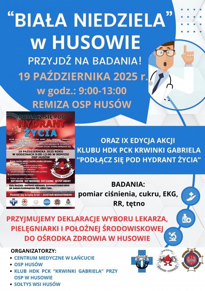 Serdecznie zapraszamy wszystkich mieszkańców i gości do wzięcia udziału w Białej Niedzieli, która odbędzie się 19 października 2025 r. (niedziela) w godzinach 9:00–13:00 w budynku remizy OSP w Husowie. W tym samym czasie odbędzie się również kolejna edycja akcji krwiodawstwa  „Podłącz się pod hydrant życia”, organizowana przez Klub Honorowych Dawców Krwi „Krwinki Gabriela” oraz Klub HDK PCK przy OSP w Husowie.